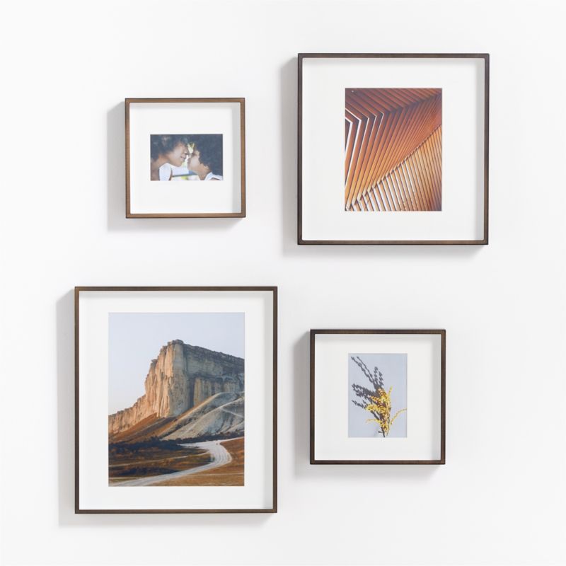 Create an instant gallery with this four-frame set. Our brushed antique bronze frames add drama to photo displays with their shadow-box styling and oversized off-white mats. A Crate & Barrel exclusive, the set unites 4"x6", 5"x7", 8"x10" and 11"x14" frames with a brushed antique bronze finish. Display the quartet in a grid, in a line down a hallway or arranged as a staggered gallery wall.