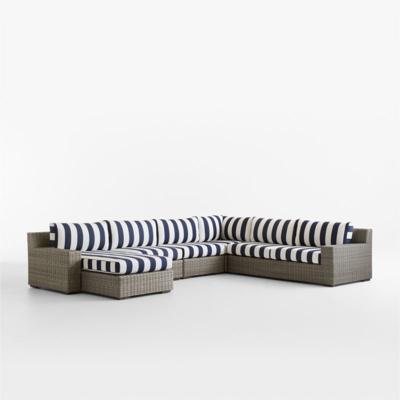 Abaco Resin Wicker 5-Piece Left-Arm Chaise Outdoor Sectional Sofa with Navy and White Cabana Stripe Sunbrella ® Cushions