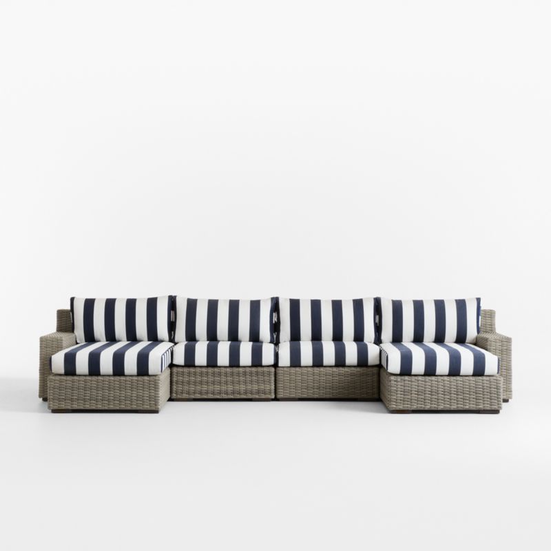 Low-slung and ready to lounge, our Abaco outdoor sectional sofa extends an invitation to kick back and relax. Comprising two armless chairs and left- and right-arm chaises, the four-piece sectional offers a deep seat and wide, boxy arms perfect for a cool drink. Handwoven with a chunky, textural weave, the weather-resistant resin wicker exhibits a variety of grey-brown shades to replicate the nuanced color of well-worn rattan. Off-white cushions covered in fade-, stain-, water- and mildew-resistant Sunbrella acrylic add an extra layer of comfort.
