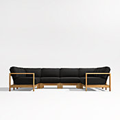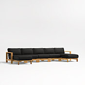 Our Anguilla three-piece sectional is a beautiful, worry-free place to spend lazy days outdoors. Exceptionally durable solid teak frames the sectionals angular silhouette, while thick, comfortable cushions covered in weather-resistant upholstery lull you into warm-weather bliss. Combining a right-arm chaise and left-arm sofa with an armless chair, the three-piece sectional sofa is crafted with roomy seats, solid construction and sleek lines for ideal patio or poolside lounging.