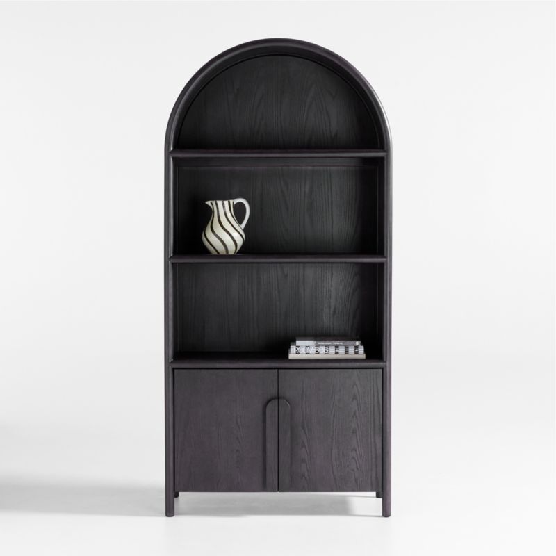 The traditional bookcase takes a contemporary turn in Annie. Made of solid oak and oak veneer with a warm charcoal finish, the bookcase showcases a rounded silhouette. Bentwood poles flow a continuous arc from leg to leg, framing open shelves and a storage cabinet with flat-front doors that show off the wood grain. Cleanly integrated into the arcing design, long, rounded pulls open to reveal one adjustable shelf. On its own, the bookcase is a stylish refresh to office, library or living room storage. Or maximize Annie's flowing lines by combining the bookcase with the coordinating media console to create a family room entertainment center.