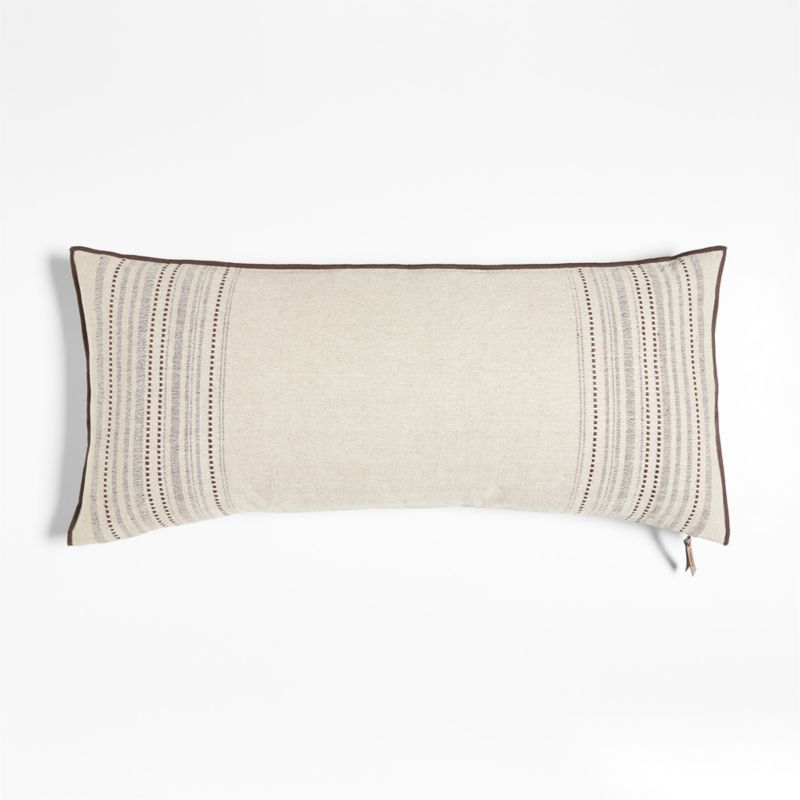 Organically varied lines stripe our Bande throw pillow for a chic and casual look. Dyed brown and ivory to coordinate effortlessly with our bedding, the cotton-linen threads stitch and weave a homespun texture and a variegated pattern. Dark brown merrow stitching finishes the lumbar pillow with a touch of crisp contrast. For maximum comfort, our exclusive textured stripe pillow includes a plush feather insert.