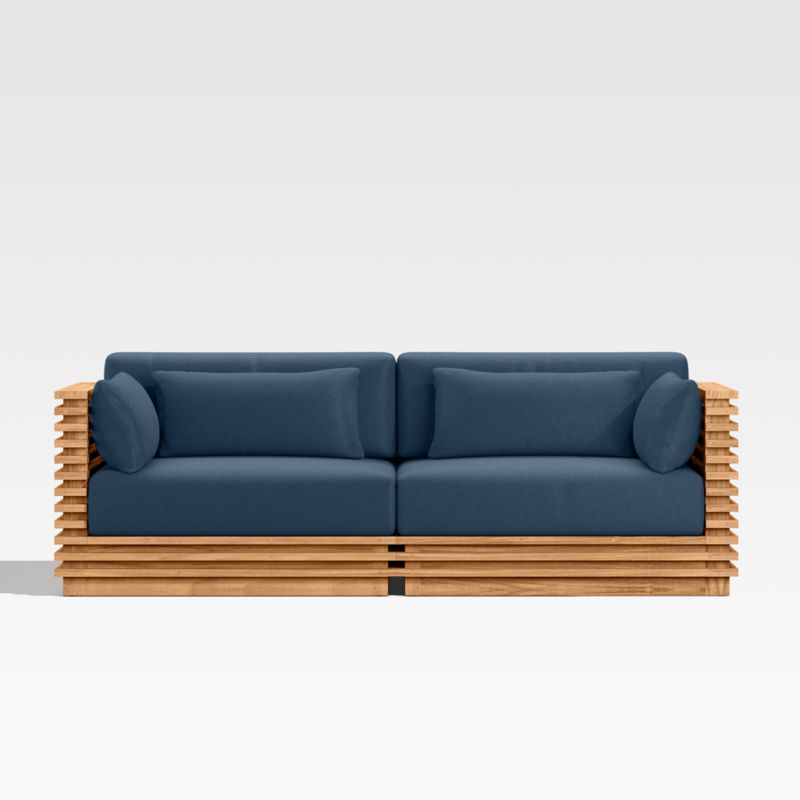 Modern and made for the outdoors, Batten's modular design flexes with your space and entertaining style. Crafted of sustainably sourced, unfinished solid teak, it is built to last a lifetime. The sofa's bold slats, striking linear profile and minimalist silhouette give it a distinctly modern look. A cozy mix of plush seat, back and lumbar cushions plus throw pillows provides unrivaled comfort and can all be upholstered in a weather-resistant fabric of your choice.