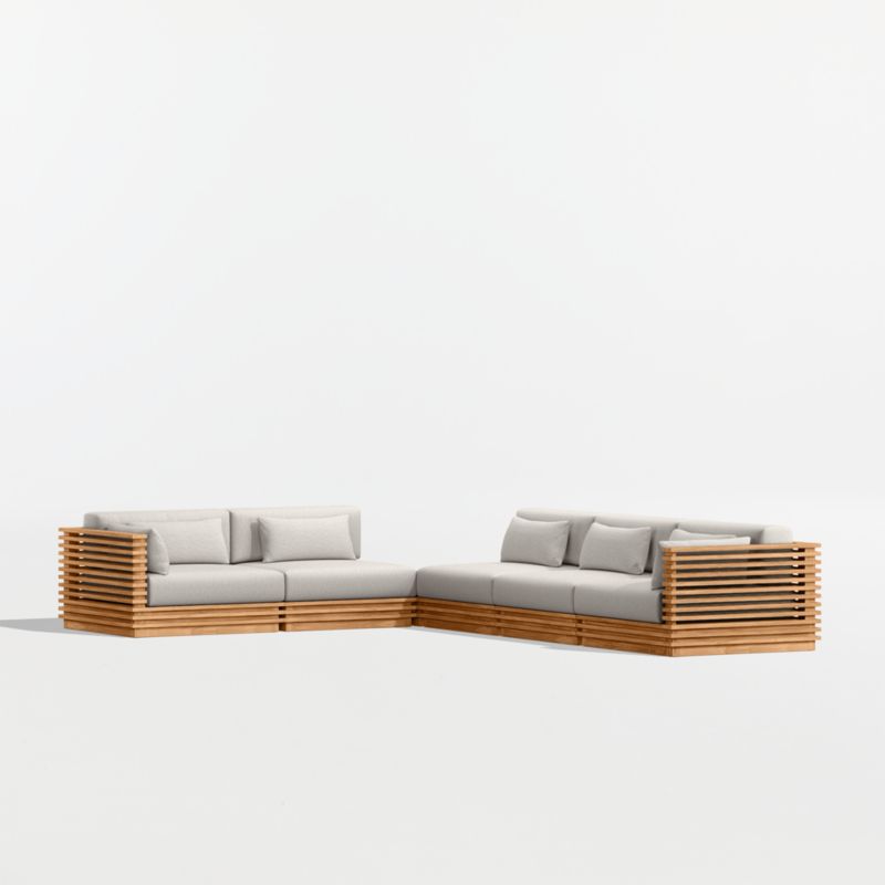Modern and made for the outdoors, Batten's modular design flexes with your space and entertaining style. Crafted of sustainably sourced, unfinished solid teak, it is built to last a lifetime. The sectional's bold slats, striking linear profile and minimalist silhouette give it a distinctly modern look. A cozy mix of plush seat, back and lumbar cushions plus throw pillows provides unrivaled comfort and can all be upholstered in a weather-resistant fabric of your choice.