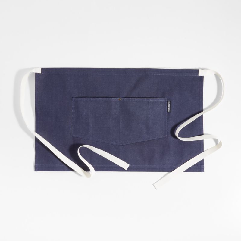 Our classic kitchen apron, now with quintessential bistro style. Sturdy yet stylish, modern yet timeless, deep blue denim makes a durable half apron that works hard and wears well. Our indigo apron boasts two waist pockets that hold your phone or tablet and a dish towel. The adjustable waist tie provides bright contrast and a comfortable fit. Finished with a denim Crate & Barrel logo tag, our organic cotton half apron coordinates with our other exclusive kitchen textiles in classic black.