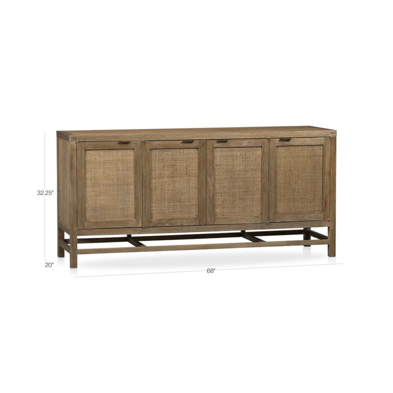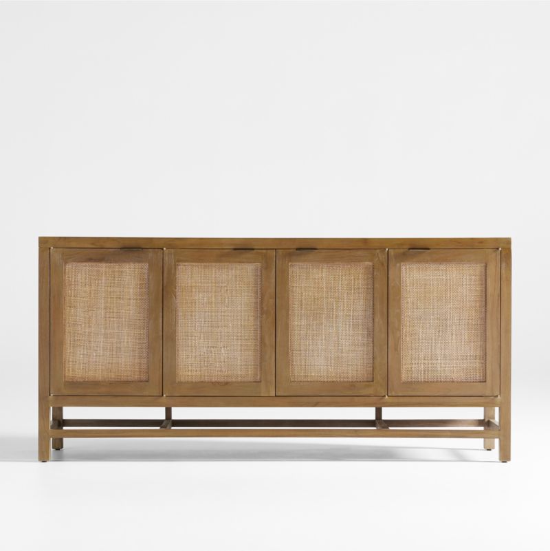 A blend of natural materials and classic design creates this beautiful, mid-century-inspired collection. FSC ®-certified teak and teak veneer frames showcase doors inset with panels of handwoven natural rattan for remote control signal access. Finished in light brown and accented with antique brass pulls, the media console brings a relaxed look to the living room, family room or office. It opens to three sections, each with an adjustable shelf. The Blake Light Brown 68" Media Console is a Crate and Barrel exclusive.