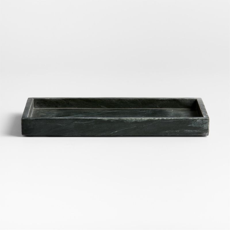 Our Bleecker collection brings the dramatic beauty of black marble to your powder room, guest bath or en suite. Sleek, modern lines keep all the focus on the stone's intriguing grey and white streaks. Cut with crisp corners, this vanity tray corrals scent bottles and jewelry or the Bleecker canister, soap pump and tumbler. Add the other coordinating gorgeous-yet-practical accessories for a unified bathroom that's ready for hosting. Due to the natural marble, each tray is fascinatingly unique.