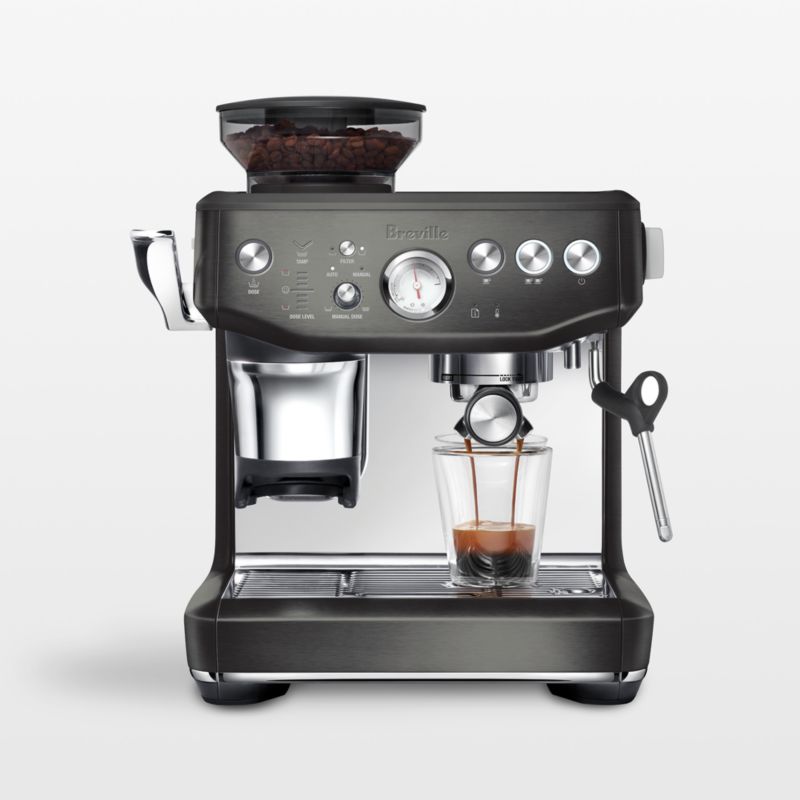 Handsome in black stainless steel, our exclusive espresso machine with stainless steel accents takes you from whole bean to impeccable espresso in less than one minute. The built-in conical burr grinder doses just the right amount of grounds and offers 25 grind settings. The ingenious puck system assists with tamping, applying precise pressure to your coffee grounds and finishing with a twist to create a perfectly polished, barista-worthy puck. Water heated exactly to the optimal temperature maximizes flavor extraction for balanced flavor. To top your drink with velvety microfoam, use the milk wand that delivers powerful steam pressure.