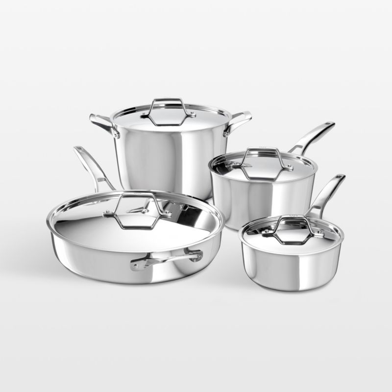 Calphalon's Premier cookware wraps a heat-responsive aluminum core with four layers of durable stainless steel. The result is an eight-piece set of classic pans that resist warping, denting and staining so the mirror-polished surfaces stay stunning. Fitted with handles that stay cool on any type of stovetop, the pans heat quickly and stand up to the oven, broiler and dishwasher. This beautifully resilient cookware set—saute pan, two saucepans and a stockpot with lids—makes an excellent housewarming, graduation or wedding gift.
