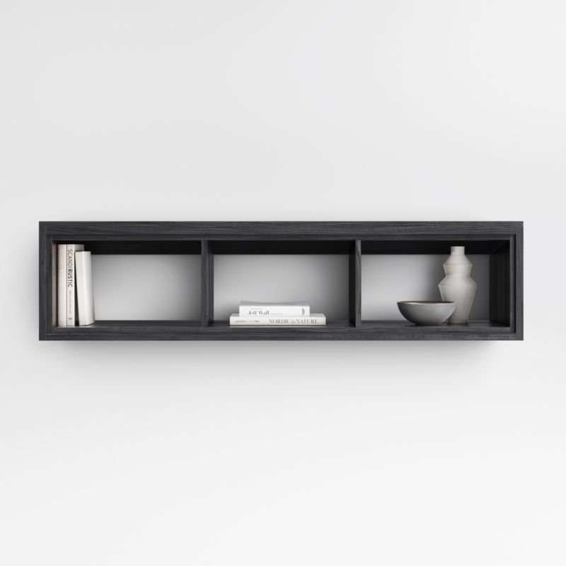 Calypso enhances the home office with a streamlined design and smart black finish. Mounting on the wall, the storage shelf features three open cubbies framed in beautiful elm and elm veneer. Stepped detailing adds linear design notes, while wirebrushing and a charcoal finish bring out the beautiful elm grain. For a coordinated home office, pair the shelf with other storage items in our Calypso collection.