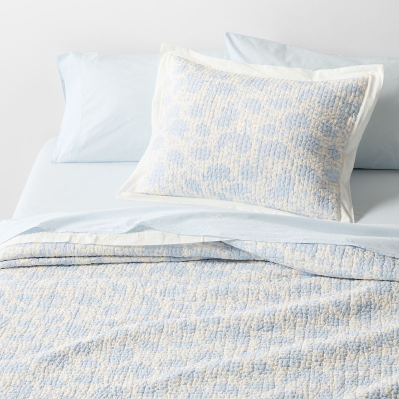 Inspired by vintage wallpaper, our Celeste quilt layers on pattern with an intricate floral design and an heirloom vibe. Tendriled vines and showy blooms twine and bloom in dreamy blue on white, giving the florals a handpainted feel. Quilted by hand, our Celeste bedspread textures organic cotton with a classic pick stitch, a hallmark of handcrafted textiles. Light blue thread adds dimension while highlighting the artisanal technique. Edged with bold flanges, the lightweight cotton-filled quilt makes a bed with subtle texture and depth. Add the matching floral or solid pillow shams to complete the modern-homespun look.