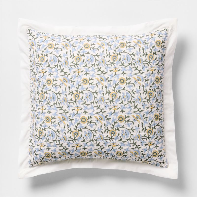 Inspired by vintage wallpaper, our Celeste pillow sham layers on pattern with intricate florals and an heirloom vibe. Skilled artisans print the flourishing botanicals by hand using traditional blocks, creating depth and fascinating variations in the vining design. After being carefully printed in blue and tan on white, the organic cotton is then quilted by hand and finished with generous flange borders. Charming variations in the printing—one of our favorite aspects of this intensive craft—make each sham beautifully unique. Add the matching quilt to complete the modern-homespun look.