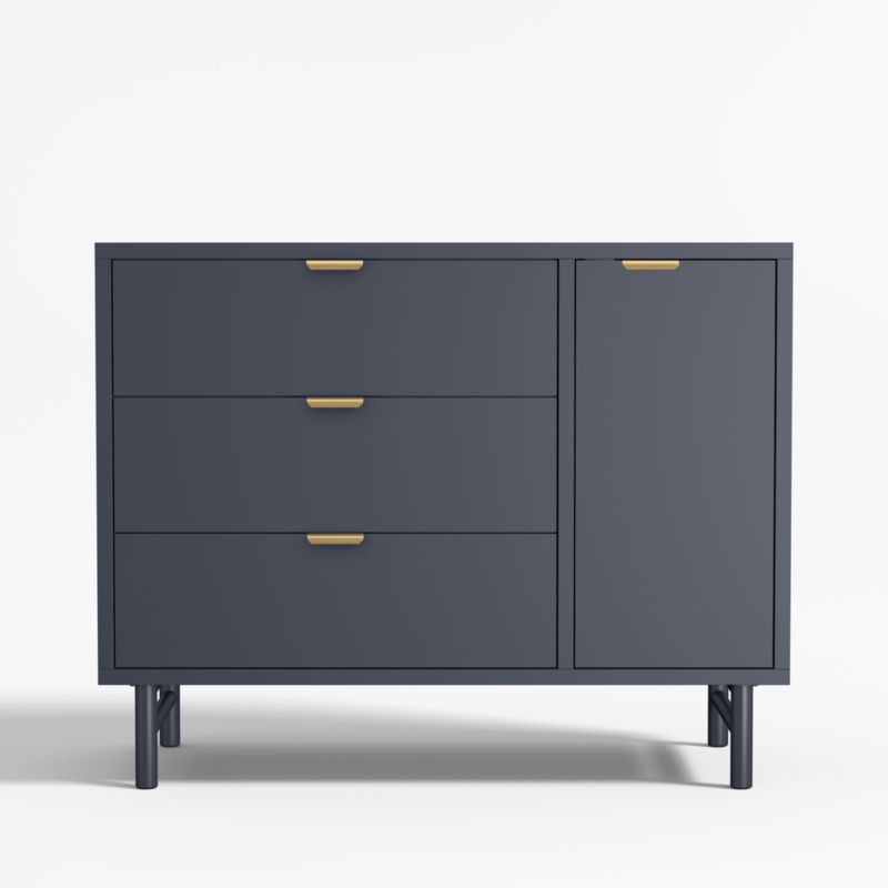 With its clean lines, our Classic collection gives a subtle nod to mid-century design—but its trend-forward colors make it a stunning addition to any modern kid's room. The dresser is a storage standout: In addition to three roomy drawers that keep clothes and linens neatly tucked away, the cabinet door opens to reveal even more storage. The deep navy blue hue with brass accents blends effortlessly with any bedroom decor, and its solid FSC®-certified wood construction is as durable as it is beautiful. Pair with other pieces from our Classic collection for a totally coordinated look.