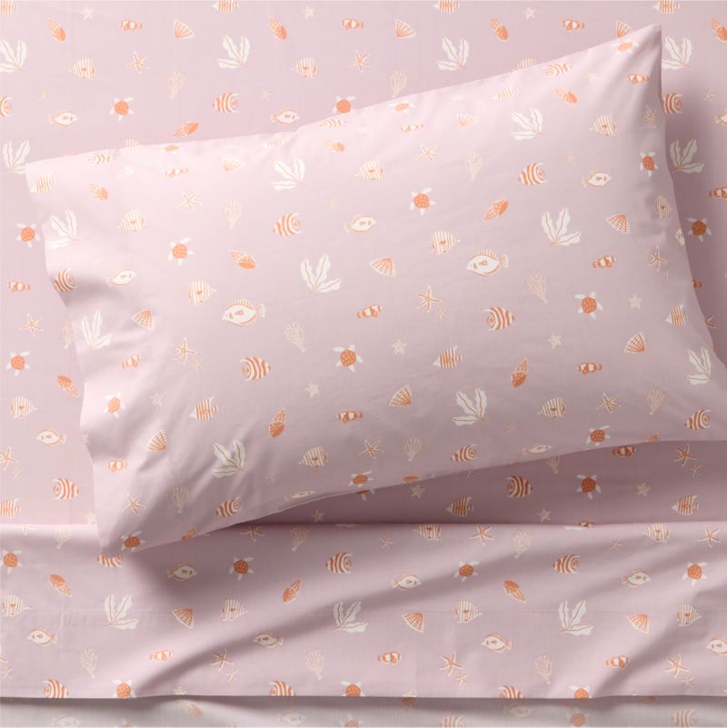 Drift off beneath the waves with our Coral Reef Dreams sheet set, where playful turtles, fish and seashells float across a soft lilac sea. Made from 100% organic cotton percale, the fabric feels cool and crisp and only gets softer with every wash. The mix of sun-washed colors and whimsical hand-drawn illustrations brings a splash of ocean magic to bedtime. Pair it with our coordinating Coral Reef Dreams quilt and sham for a fun under-the-sea moment.