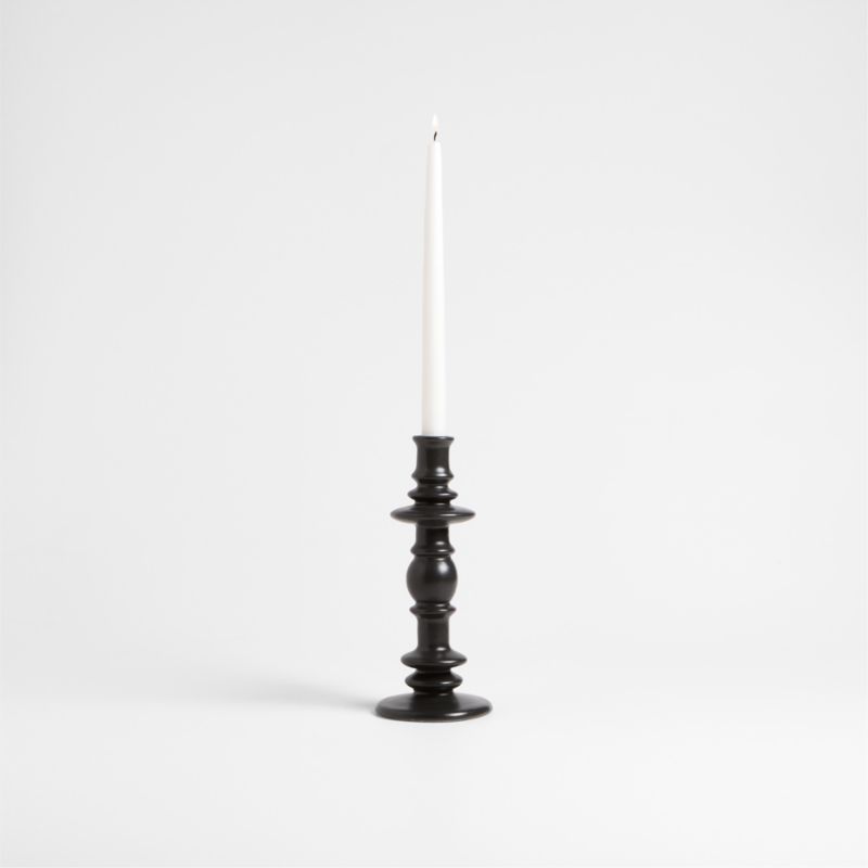 Reminiscent of cairns, our Cortana candle holder stacks forms in an ornate, organic silhouette. Reactive dark charcoal grey glaze coats the earthenware, giving the large candlestick a subtly speckled and textured finish. The effect is casual and effortlessly elegant to suit modern dining tables.