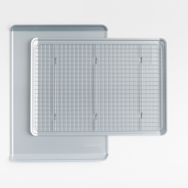 Super durable, lighter than cast iron and exclusively ours. Ideal for new homeowners or couples starting out, this three-piece silver cookie set gathers together essential bakeware from our exclusive collection that takes its cue from professional kitchens. Made of carbon steel—an alloy of 99% iron and 1% carbon that's nearly indestructible—the two cookie sheets heat quickly and maintain consistent temperatures for perfectly baked treats. Reinforced rims prevent warping, while two flat sides allow baked cookies to slide off effortlessly. The rack cools baked goods quickly and thoroughly. A double layer of silicone-based non-stick coating ensures easy release and quick cleanup.