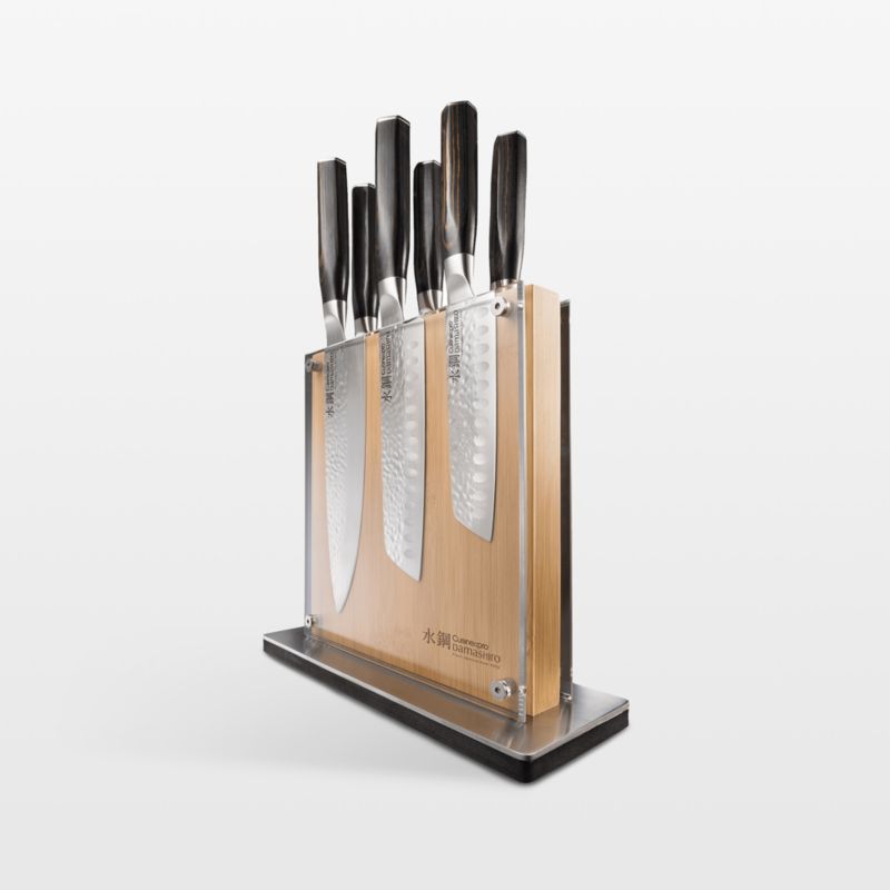 Inspired by traditional Japanese craftsmen and samurai sword makers, Cuisine::pro Damashiro Emperor knives feature stunning Damascus-style patterned blades suggestive of flowing water. The knives are made of ice-hardened Japanese steel, making them tough, shatter-resistant and able to hold a razor-sharp, resilient edge. Equipped with handsome, ergonomically designed wood handles finished in dark walnut, the six knives in the Shi set are showcased in a modern, see-through block made of walnut-finished acacia and clear acrylic.