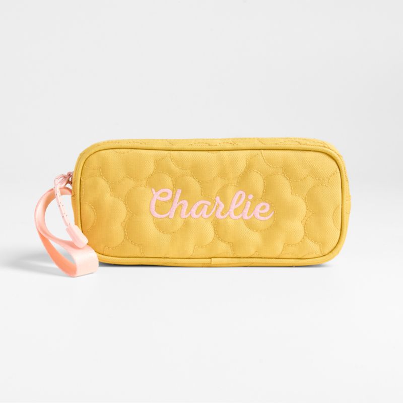 A fun pencil case that's built to handle all the thrills of the day. A pattern of quilted blooms add sunny vibes to the yellow exterior, and the contrasting pink zipper, zipper pull and loop handle give it the perfect finish. Constructed of supremely durable polyester fabric that includes recycled plastic bottles, our roomy, easy-clean case makes it simple to keep all their pens and pencils organized and accessible. Pair with the Quilted Yellow Flower lunch box and matching backpack for a totally coordinated look.