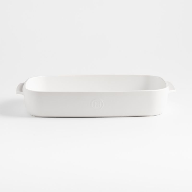 In this beautiful collection designed exclusively for Crate & Barrel, the classic and beloved ceramic bakeware of Emile Henry gets a modern update with softly curved organic lines and refined details. This rectangular baker's clean, rounded corners and minimalist—yet functional—handles go from oven to table for serving breakfast casseroles, lasagna and bar cookies. Crafted of Burgundy clay renowned for its superior heat retention, the baking dish is finished inside and out with an exclusive matte cream glaze that resists chipping, cracking and thermal shock. All of the heirloom-quality pieces in our Emile Henry collaboration make extra-special housewarming, graduation and wedding gifts.