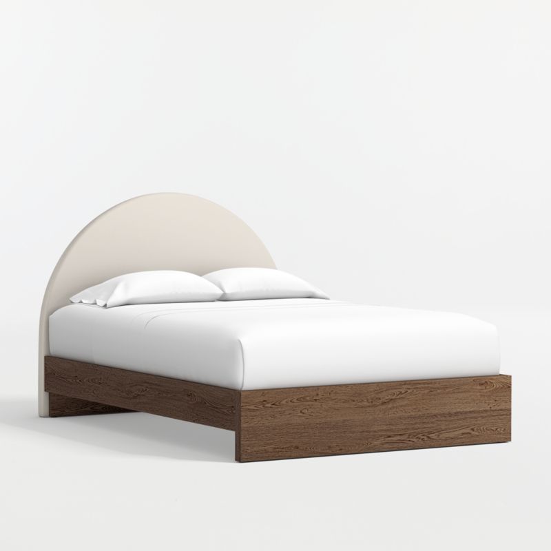 Playful, practical and perfect for the kid's room in every way. Our Emma upholstered bed features a whimsical arched headboard wrapped in softly textured upholstery to create a cushy space for reading and dreaming. Add to that the richness of a deep brown wood base, and you have a modern, versatile bed that works with any decor style, at any age.