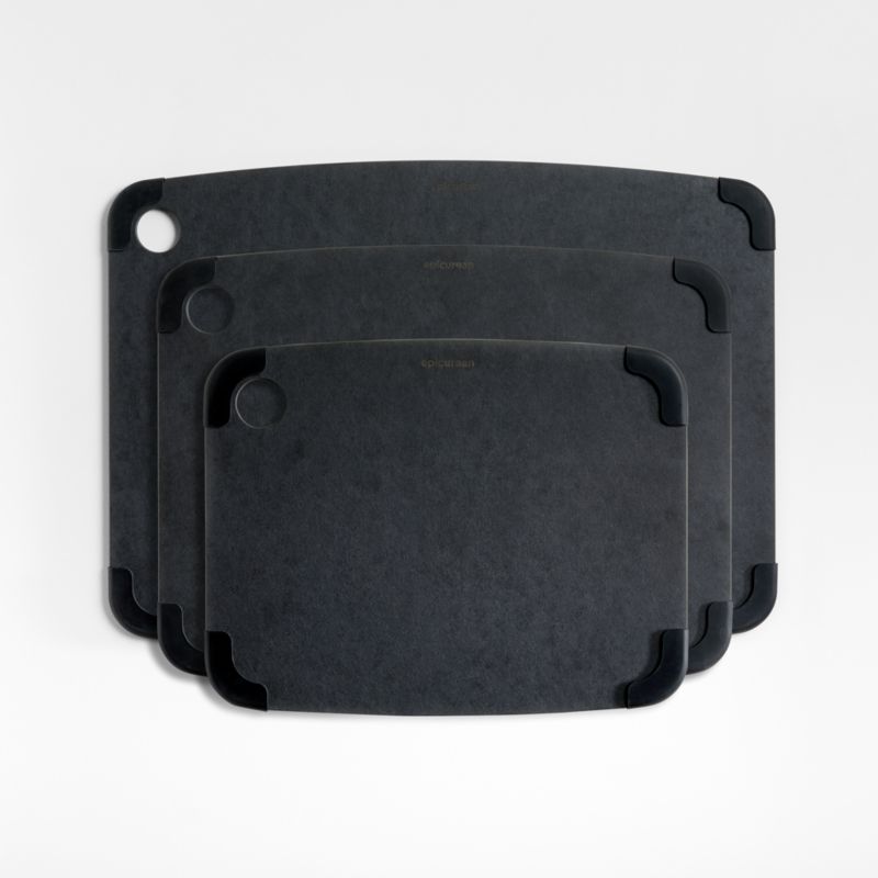 These easy-care slate grey cutting boards double as a trivet or chalkboard. Made of a durable mixture of woods, the board is knife-friendly, non-porous and will not harbor bacteria. Dishwasher-safe, reversible board is equipped with removable silicone corners to keep the board from slipping.