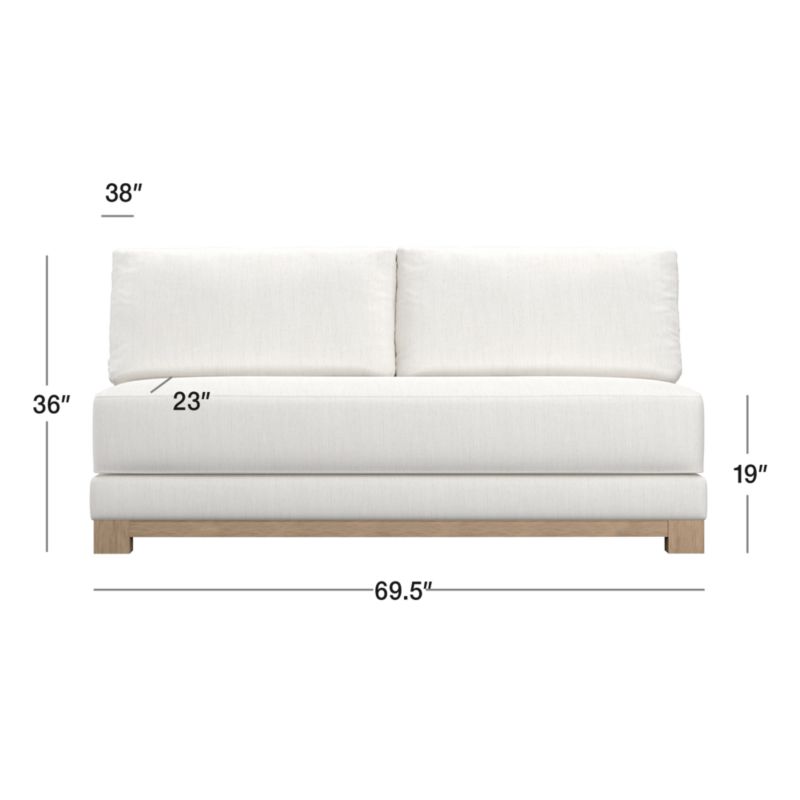 Striking the perfect balance between comfort and modern style, our Gather Petite sectional seating is clean-lined, current and scaled to suit small spaces. Anchored by a natural wood base, the armless sofa welcomes you with boxy, extra-plush seat cushions designed with inner-coil construction for maximum comfort and durability. Trim top-stitching keeps the look neat, not fussy. The Gather Petite wood-base armless sofa is a Crate & Barrel exclusive.