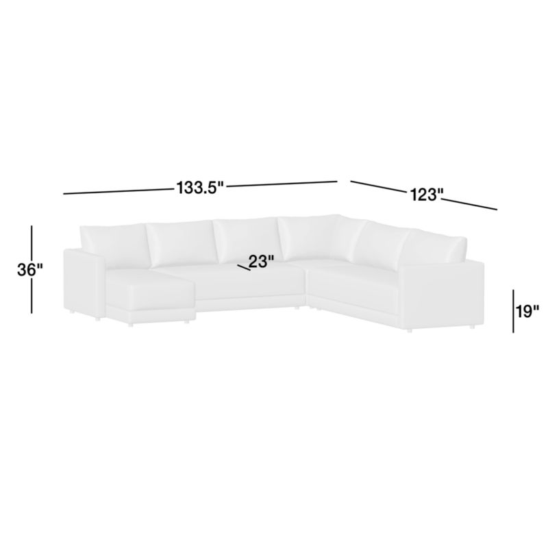 Gather 4-Piece L-Shaped Bench Sectional Sofa with Chaise Lounge26"Hheight133.5"Wwidth123"DdepthMeasurements are in inches.66.04Hheight339.09Wwidth312.42DdepthcmMeasurements are in centimeters.