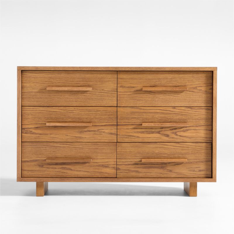 Our Grayson 6-Drawer Dresser is such a timeless bedroom piece, your child just might wind up taking it to their first apartment. Crafted from solid oak, it features a clean, modern profile and medium brown finish with wire brushing that beautifully highlights the wood grain. Six smooth-gliding drawers provide a generous amount of storage. Pair it with other pieces in our Grayson collection for a complete look.