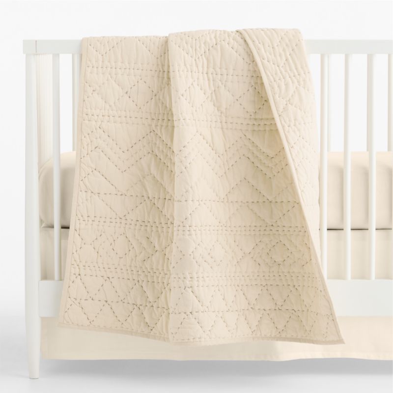Made to be loved from the very first snuggle, our Heirloom Stitched organic cotton crib quilt is hand-stitched with a geometric pattern in 2 tones of thread. The traditional kantha quilting technique layers fabrics with a simple running stitch, creating a cozy, cushy texture little hands will love to trace. Soft, organic cotton feels gentle on newborn skin and wears beautifully over time. This heirloom-quality blanket is designed to be loved now and treasured for years to come.