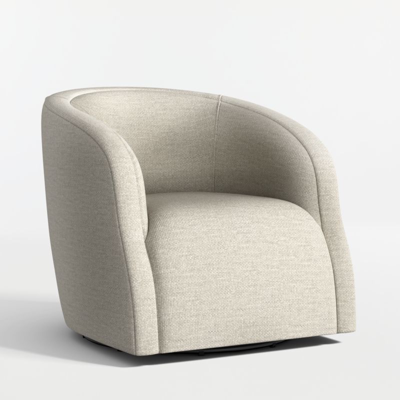Inez snuggles with comfortable cushioning and embracing curves. Tight tailoring creates a sleek silhouette, showcasing the barrel back and waterfall seat. Swiveling a full 360°, the chair gives you a sweeping view of the room.