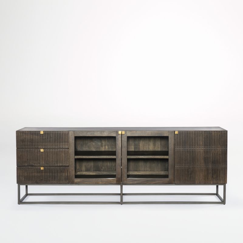 Finished in vintage brown and distinguished by artisan-like carving, this finely crafted mango wood console reinterprets media storage with a global-meets-industrial attitude. Elevated on an airy cage of slim black iron, the media console provides lots of storage options with three drawers, an open cabinet with double glass doors and a single closed cabinet. Square iron pulls punctuate with a warm burnished brass finish.