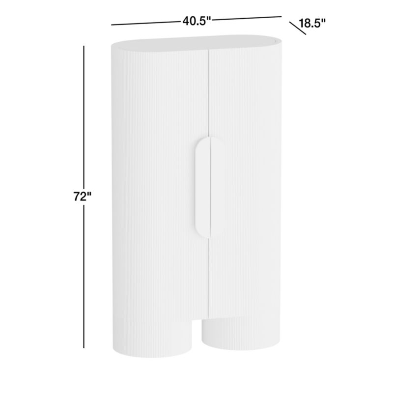 Bold-yet-accessible, our Kahn storage cabinet elevates your home decor with its unique blend of natural materials, modern design, and thoughtful functionality. Supported on wide cylindrical legs, the racetrack-shaped cabinet has a striking curved exterior wrapped in solid ash ribbing that's whitewashed for a light and airy look. A rounded slice of cream marble serves as the handle, opening up a well-equipped interior that lets the cabinet perform a variety of functions—from coffee bar to drink station. Storage options abound with two adjustable shelves, a fixed lower shelf, work surface and large curved drawer. Cord-management cutouts at the rear enable seamless integration of coffeemakers, blenders and other small appliances.