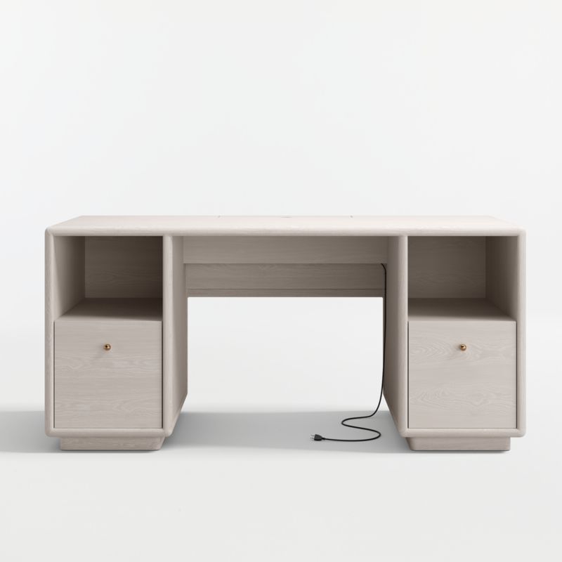 Inspired by our Lafayette bedroom collection, this desk possesses the same pleasing rounded contours and clean lines with a fresh pearl grey finish. Radiused edges soften the desk's linear silhouette, with a generous work surface that bridges two compartments—each with an open shelf and drawer. Made of white oak, the desk is given a bleached ash finish to accentuate the wood's cathedral grain. A cubby under the desktop houses power outlets for a lamp, printer, laptop and phone.