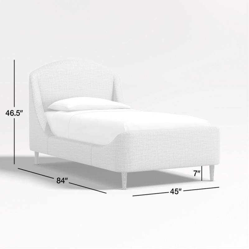 Lafayette streamlines the sumptuous curves of a French-style chaise into an upholstered bed for the modern bedroom. Fully upholstered in a misty linen-like fabric, the bed curves down from the gently rounded headboard to slim rails that gracefully climb to form the lower-profile footboard. Turned solid oak legs have a grey finish to complement the upholstery and keep the look fresh and modern.