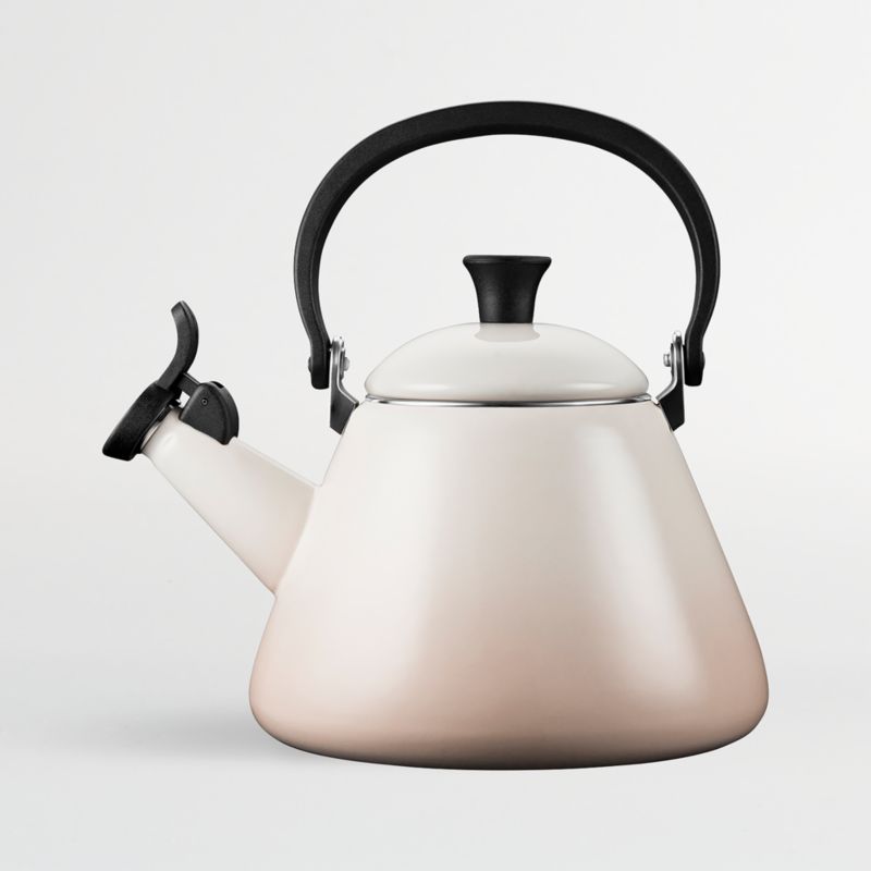 Enhance the daily ritual of preparing tea or coffee with this stylish kettle from Le Creuset. With its cone-shaped contours, arching black handle and enamel coating the color of baked meringue, this kettle updates a kitchen essential with modern lines and an elegantly neutral color. Suitable for all stovetops, including induction, the carbon steel kettle is clad in chip-resistant porcelain enamel.