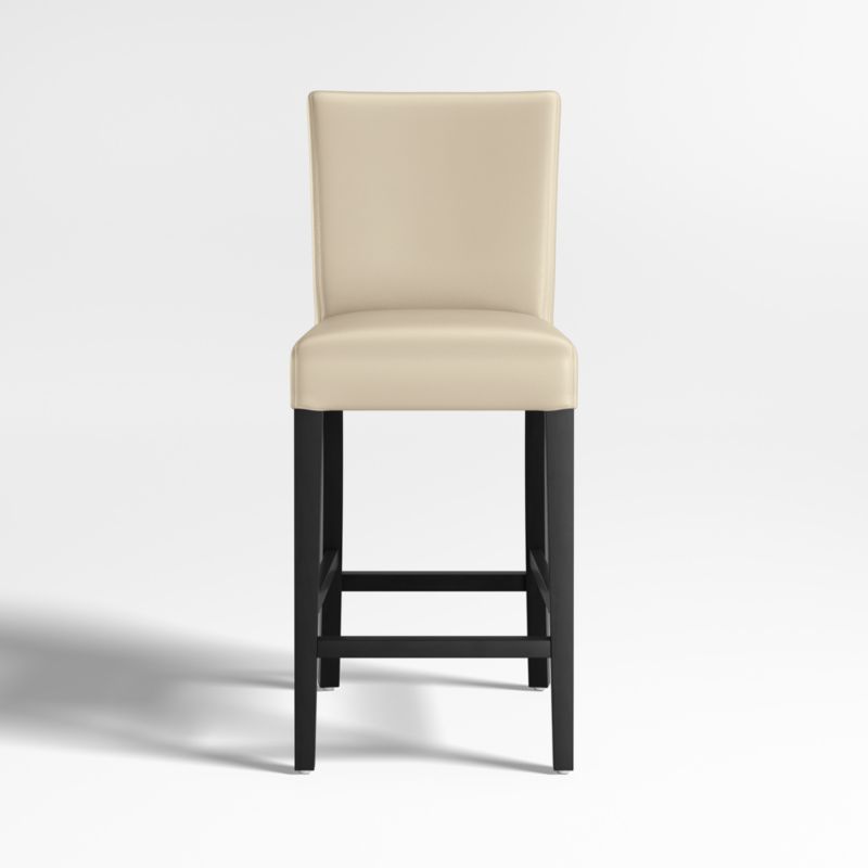 Stylish and contemporary stools with a classic Parsons heritage were designed and tested for use in commercial spaces such as offices, restaurants and hotels. Upholstered in chic ivory leather with a soft, pebbled texture and double saddle-stitch tailoring, the Lowe bar and counter stools are long and lean, with a roomy, cushioned tight seat and back perfectly proportioned to the frame's slim ebony-stained legs. The Lowe Ivory Leather Stools are Crate and Barrel exclusives.