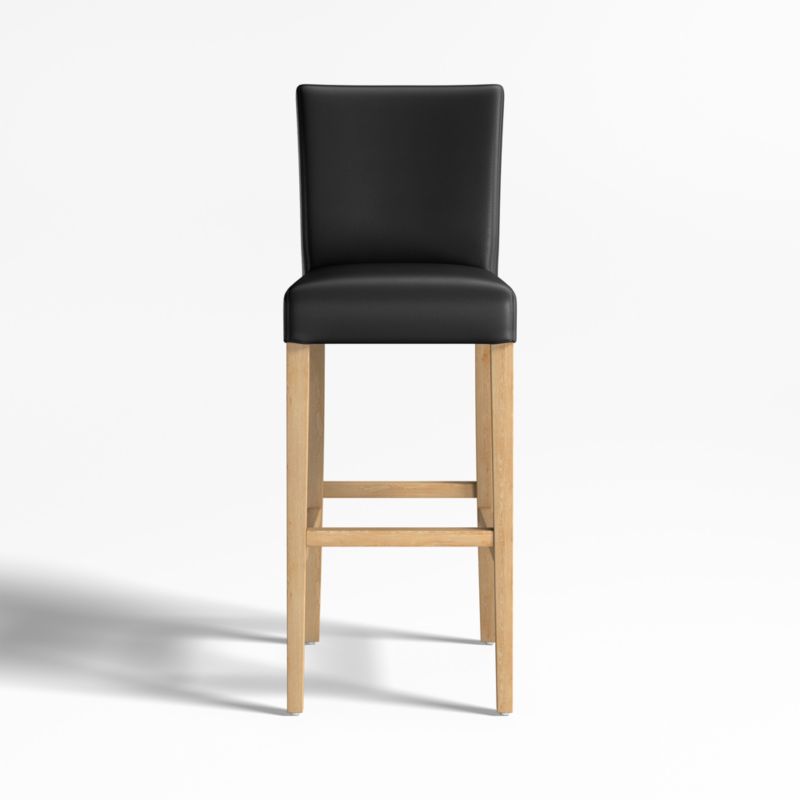 Lowe pulls up to a bar or high-dining table with a roomy cushioned seat and back designed for lingering. Sleek black leather tailors the cushioned, tight seat in sophistication, pairing perfectly with slim, natural-finished hardwood legs. Our Lowe collection's many seating options in an array of coordinating leathers and fabrics mix and match for the perfect look. The Lowe upholstered leather bar stool is a Crate & Barrel exclusive.