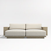 Settle into the enduring coastal comfort of Mallorca. Designed to last season after season, the sofa showcases the long-lasting durability and natural beauty of eucalyptus wood, which has been painted and wirebrushed to resemble naturally weathered driftwood. The linear frame's modern lines and bold geometry feature wide arms and a plinth base for a contemporary look. Soft-yet-supportive cushions are covered in outdoor-friendly ivory fabric or your choice of colors in performance Sunbrella fabric.