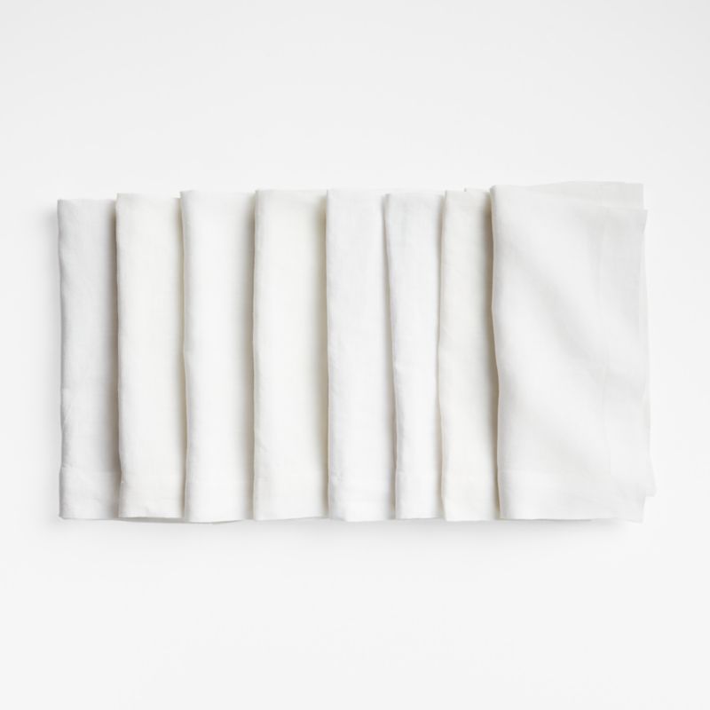 Our 100% linen napkins unfold to generous 22" squares in beautifully neutral and vibrant hues, pre-washed for extra softness. A Crate & Barrel exclusive, this set of eight white cloth napkins pairs perfectly with modern dinnerware and cleans up easily in the washing machine and dryer. We've finished each napkin with generous hems and mitered tailoring, classic diagonal seaming that creates a crisp corner.