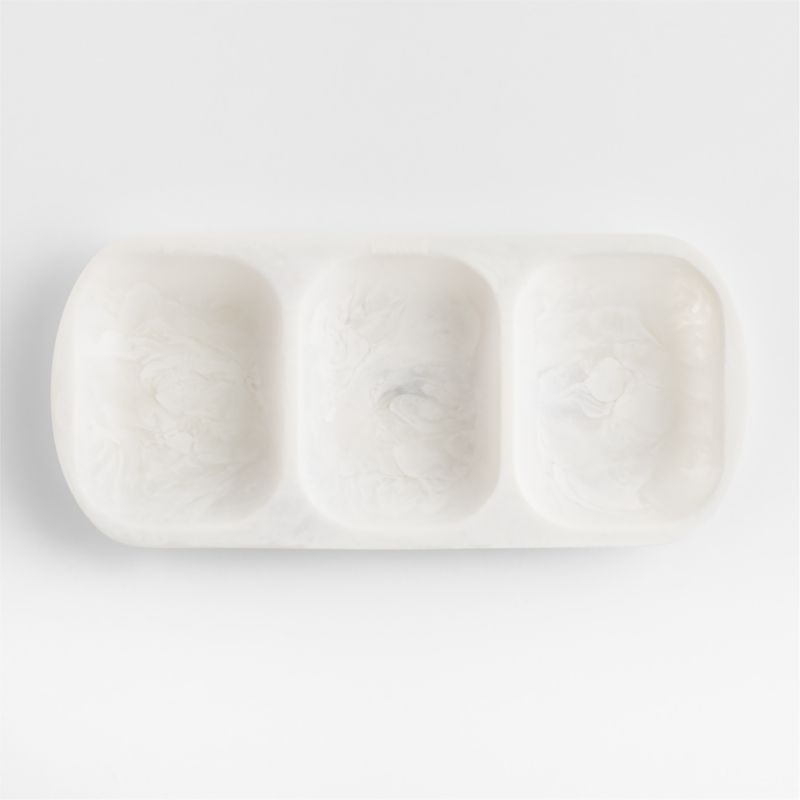 Emulating the luminous look of alabaster, each hand-polished Naya resin server exhibits its own unique pattern. The divided server is shaped with three integrated bowls for serving nuts, appetizers, candy and more, enhancing outdoor entertaining with its clean silhouette, shatterproof durability and fool-the-eye take on natural stone.
