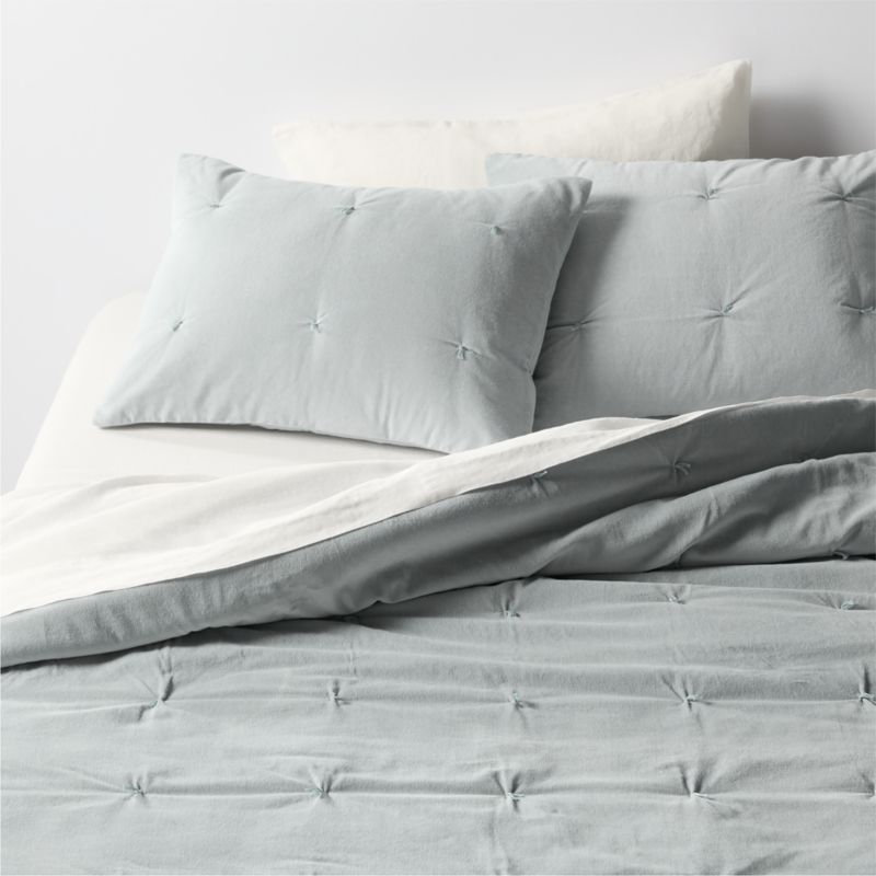 A beautiful blend of linen and organic cotton weaves our uniquely textured velvet bedding. Slubbed for a matte, understated glamour that's oh-so-modern, the velvet quilt dresses up the bed with coziness and color. Tufting finishes the misty blue bedspread with a grid of petite tassels. Layer the quilt with our other bedding in the same pale hue for a serene monochromatic look or with our white sheets to add crisp contrast.