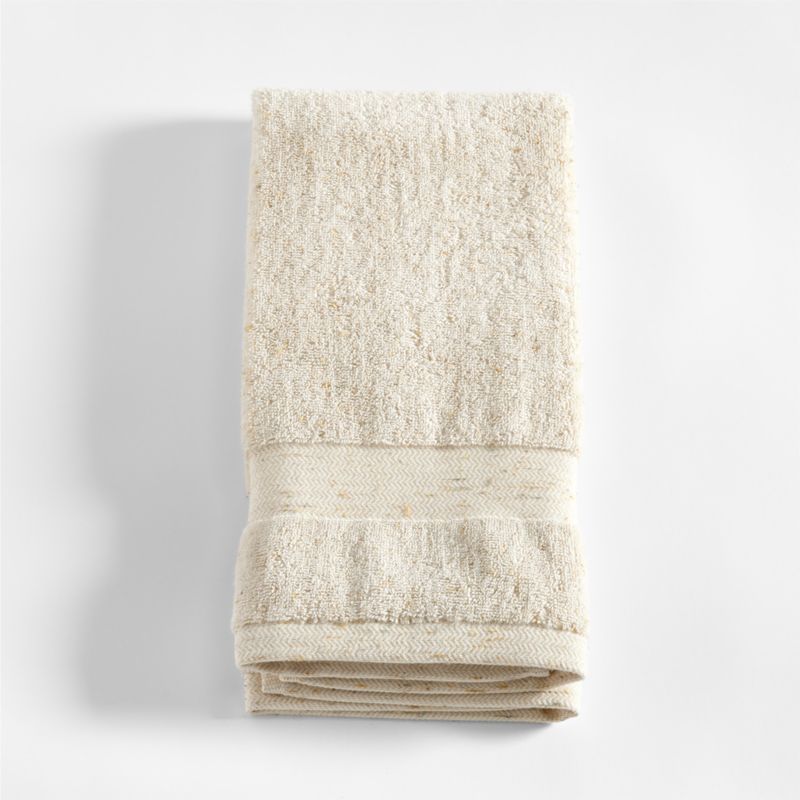 Indulge in the plush softness of our organic Turkish cotton hand towel. The beige tones and flecked detail come from tiny bits of contrasting color that are twisted into the cotton fiber as it's spun into yarn. At 550 grams, the towel has a lighter hand than our other Turkish towels with all of the exceptional absorbency and durability. Dobby weave bands at both ends adds a bit of textural detail to the woven cotton towel. Washing will only make this exceptional towel more absorbent and soft. For a full-service, well-coordinated bathroom, team the beige-flecked hand towel with the matching bath sheet, bath towel, washcloth, bath mat and robe.