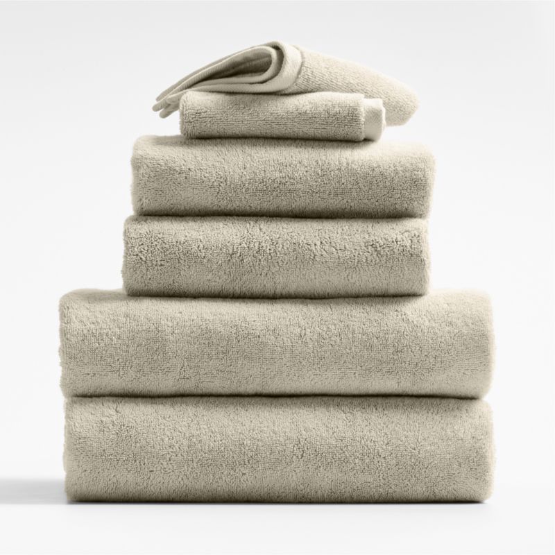 This set combines a full-suite—two each of washcloths, hand towels and bath towels—of luxurious Turkish organic cotton towels in creamy taupe for a sumptuously outfitted spa-like bathroom. Extremely plush, dense and incredibly soft, the towels are made of double-ply organic cotton threads to ensure strength and durability. Each one is woven with looped construction to dry quickly and with an intricate herringbone dobby weave along the border for a bit of elegant detail. Washing will only make these exceptional textiles more absorbent and soft.