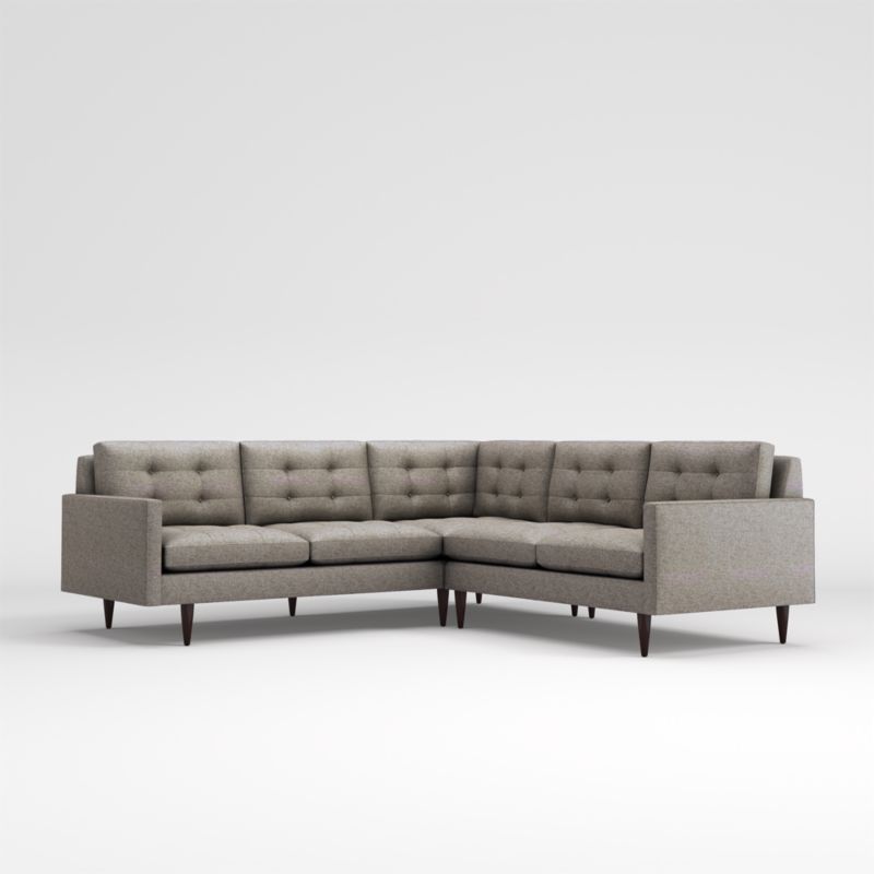 Now a Crate and Barrel classic, its pure 1960s aesthetic is scaled deep so you can sit firm and upright, but also slouch back in comfort. Well-suited to make a great impression, the menswear-inspired fabric tailors Petrie's sleek, boxy cushions and slim track arms with heathered color and soft texture. Here, we've paired the left arm corner sofa and right arm loveseat; you might also choose to add companion pieces from the Petrie Sectional Collection. The Petrie 2-Piece Corner Midcentury Sectional Sofa is a Crate and Barrel exclusive.