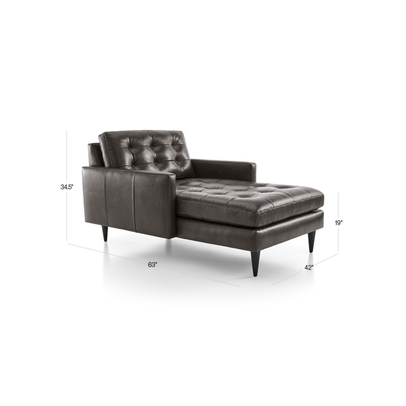 Positioned at the intersection of mid-century and today, the Petrie chaise impresses with its clean lines, soft leather and tailored cushions expertly button-tufted by hand. Now a Crate and Barrel classic, the chaise's pure 1960s aesthetic is scaled deep so you can sit firm and upright while stretching out in comfort. Sleek, boxy cushions and slim track arms look elegant and polished thanks to its supple, luxurious leather that will develop a beautiful, natural patina over time. The Petrie Leather Midcentury Chaise Lounge is a Crate and Barrel exclusive.