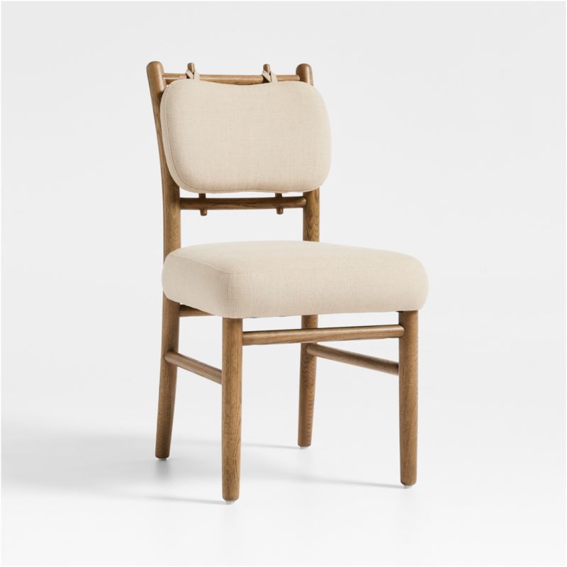 Crafted with vintage-inspired woodworking, our carefully designed oak dining chair showcases subtly tapered legs, bullnose feet and through-dowel detailing on the back crossbars. A linen-blend, natural-hued fabric layers on texture to the well-padded seat and the removable cushion that attaches to the back with fabric straps.