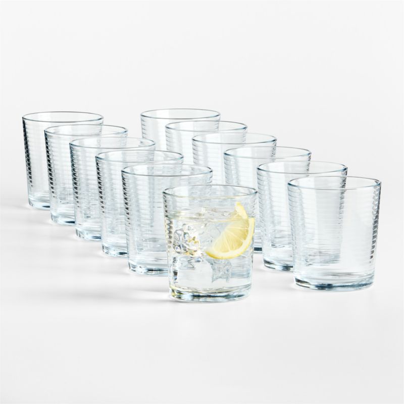 These sturdy, ringed glasses have vintage charm and modern simplicity. Embossed with parallel rings from top to bottom, our double old-fashioned glasses are the right size for the classic Old-Fashioned cocktail, a blend of bourbon or rye whiskey, sugar, water and Angostura bitters garnished with an orange peel. With their clean lines and classic shape, these twelve Rings glasses look fantastic displayed on open shelving, on a bar cart or in a glass-fronted cabinet. To complete your glassware collection, add our Rings juice glasses and the pint-capacity cooler glasses.