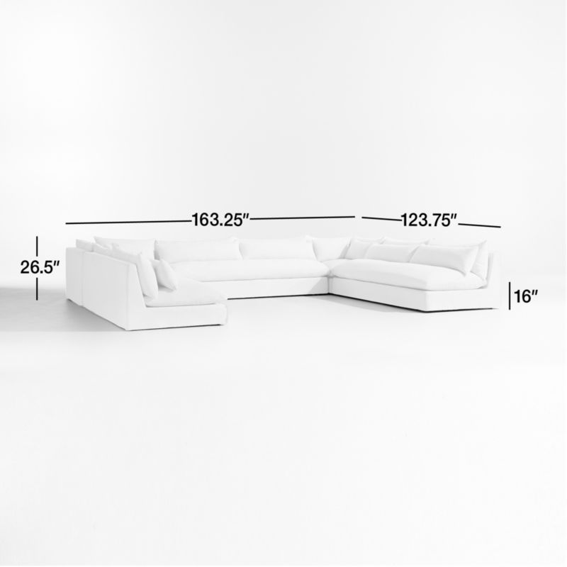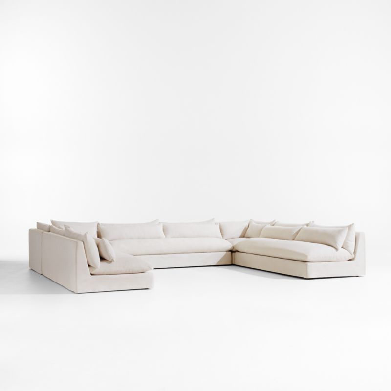 So easy and breezy, you may never want to leave the cozy confines of our Seascape U-shaped sectional. Slung low on slim bases, three sofas and a pair of corner chairs play host to extra plush, pillowy soft bench seats as well as a double line-up of scrunchable throw pillows and back cushions. Crisp white slipcovers in a linen-textured fabric enhance the Seascape's casual attitude and beachy flair. The Seascape outdoor five-piece sectional is a Crate & Barrel exclusive.