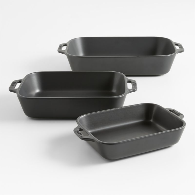 Staub bakes breakfast, dinner and dessert with a trio of stoneware baking dishes with a glass-porcelain enamel finish that prevents absorption of moisture. Enjoy warmly spiced apple crumble, cheesy lasagna and decadent peppermint brownies baked in the matte black ceramic bakers. Extremely resistant to impact and thermal shock, the dishes go straight from freezer to oven to table for a classic presentation, with loop handles providing a sturdy grip.