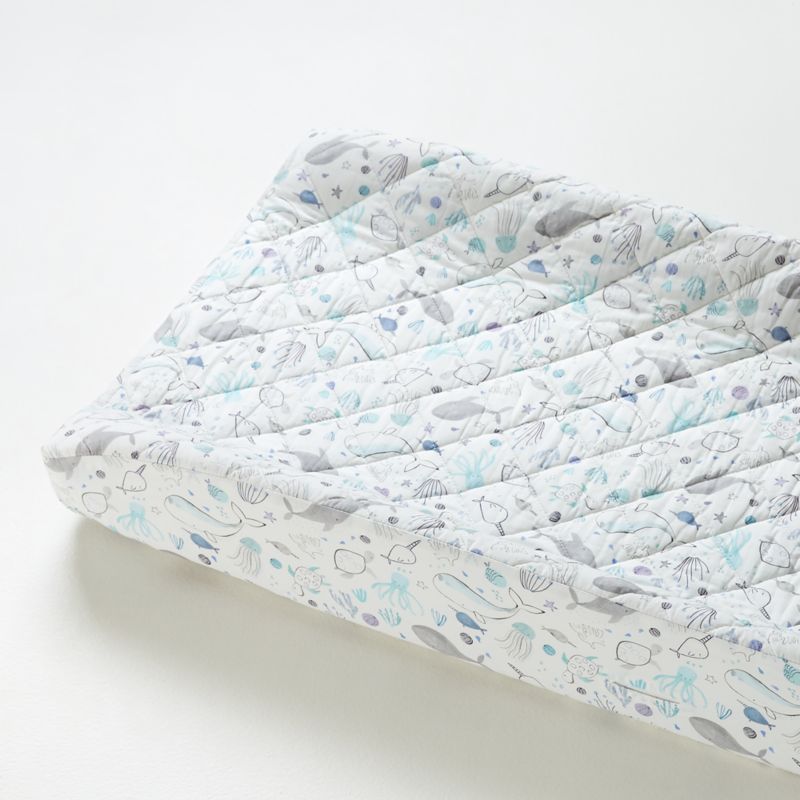 Countless creatures frolic beneath the waves, swimming across our Sea Changer Cover. Sweetly illustrated in oceanic shades of aqua, purple and grey on bright white organic cotton, the narwhals, sea turtles and all their fishy friends delight animal-loving little ones. For a coordinated nursery, pair the changing pad cover with the other pieces in our exclusive sea-themed collection.